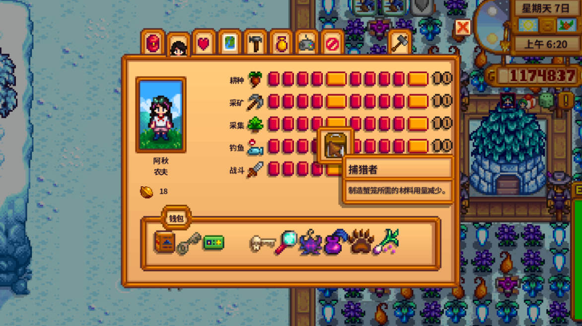 7.研习新的技能:游戏中你可以通过提升农业、采矿、钓鱼、战斗和集藏类技能来提高挣钱的效率,每个技能等级提升都会解锁新的工艺制品或增加资源获取。