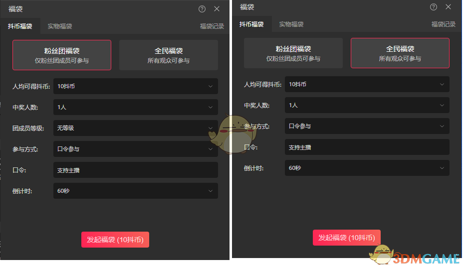 2、福袋分为抖币福袋和实物福袋,抖币福袋给中奖粉丝发放抖币、实物福袋是给粉丝发放非抖币物品。每种福袋分为粉丝团福袋和全民福袋。目前,抖币福袋默认都有权限,10w+粉丝的主播会自动开通实物福袋权限。