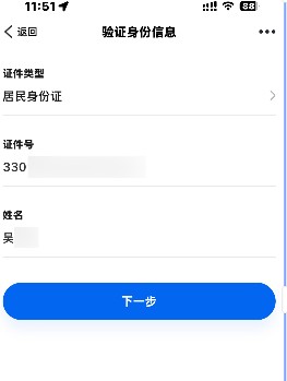 2、选择证件类型,输入您的证件号及姓名,输入完成后点击【下一步】