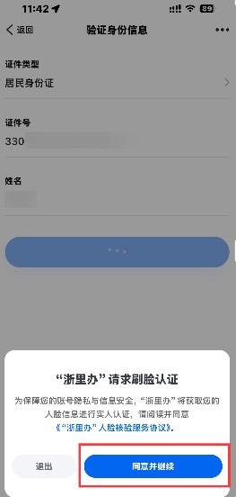 3、在跳出的刷脸认证处点击【同意并继续】