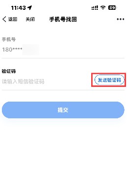 4、人脸通过后点击【发送验证码】,输入后点击【提交】,完成手机号找回,可用找回的手机号重新进行注册。