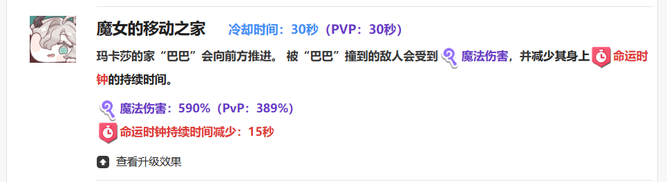 而玛卡莎的第二个技能叫做魔女的移动之家,这个技能冷却时间非常快,只有30秒,而且比较特殊的一点是跟其他角色的冷却机制不一样,很多角色的技能在推图以及PVP里面,冷却时间是不一样的,但是玛卡莎她在冷却时间上面。不管是参与推图还是PVP冷却时间上面都是30秒,所以这个冷却时间对玛卡莎来说,效率根据不同的场景产生的变化不会特别大,她的这个技能在使用的时候,她的家还会出现在场景中,她的家名字叫做巴巴,此时巴巴会向前努力的推进,只要是被巴巴撞到的敌人,受到的伤害都是魔法类型的伤害。