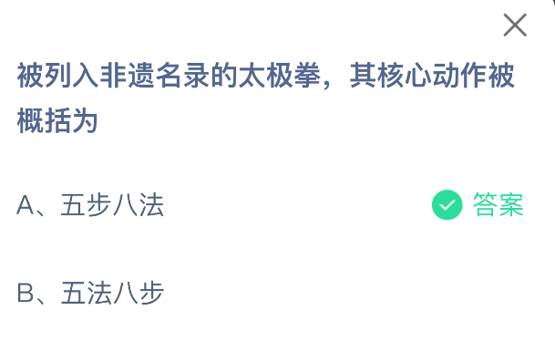 被列入非遗名录的太极拳,其核心动作被概括为?支付宝小鸡课堂开课啦!每天花一分钟答题赚饲料,喂喂小鸡就能贡献爱心啦!轻松又意义十足!2025年9月26日蚂蚁庄园的小鸡课堂题目正确答案是【五步八法】,太极拳注重意念修炼与呼吸调整,以五步(进、退、顾、盼、定)、八法(掤、捋、挤、按、采、挒、肘、靠)为核心动作.