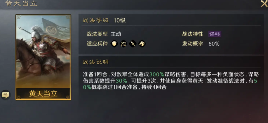 张角可在黄金阵营中与张宝,张良这两个武将进行强强联合,而由这三个核心武将组成的阵容是以防御技能为主的,在防御方面甚至达到了无人可及的高度,张角可以作为主将坐镇整个中枢结构,他所拥有的技能组也为大家展示了攻守兼备的原理和战绩效果。最为核心的主动技能还是要当属黄天当立。在兼具即时伤害与防御能力超强的双重功效情况下还能够瞬间释放对敌人造成较高打击效果的技能,这一技能可以是全军拥有持续6秒钟的防御增益效果。