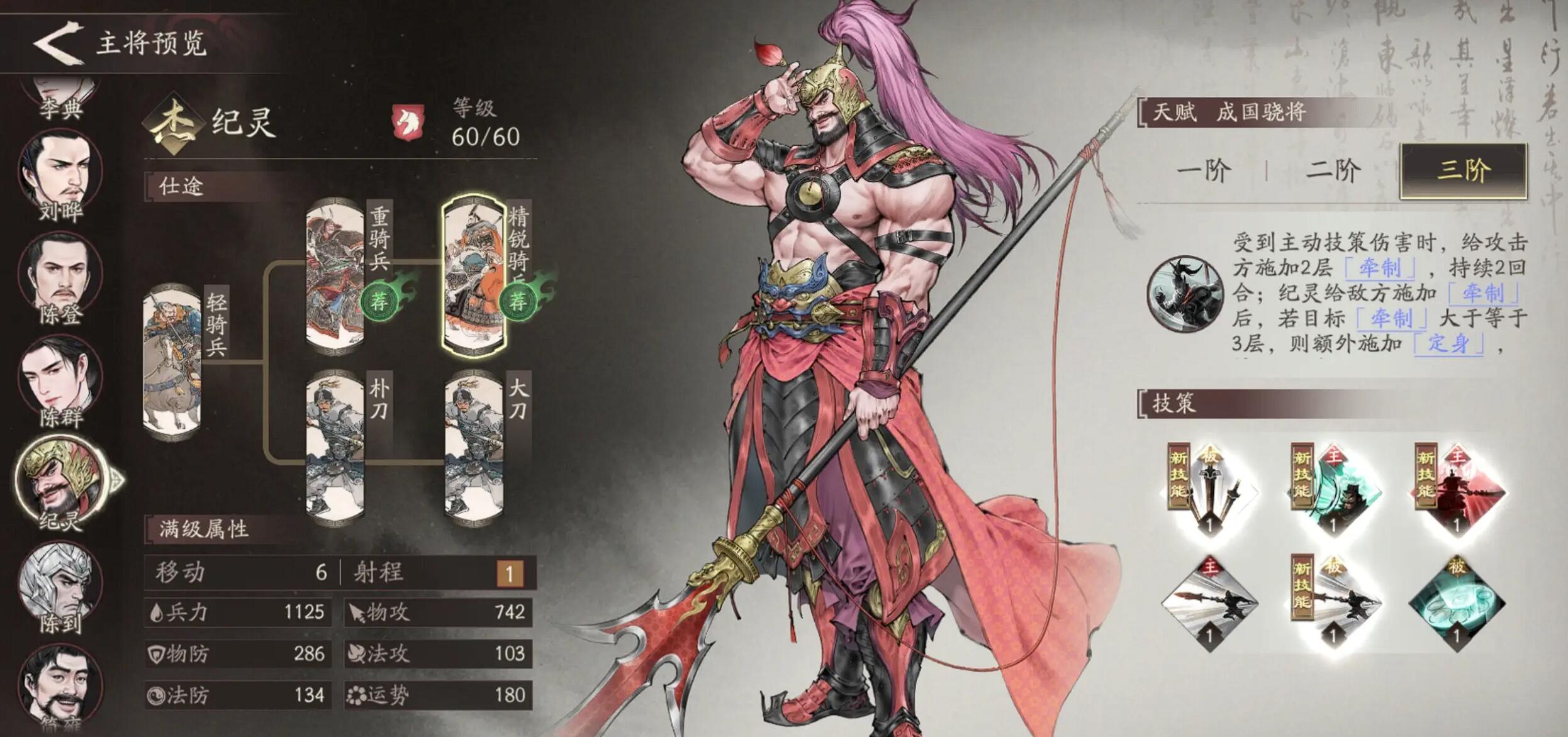 三国望神州纪灵怎么样?三国望神州的整个骑兵系统玩法之中,纪灵算是个容易被低估的强势角色。一阶时确实平平无奇,可升到三阶解锁定身和阻挡领域后,有质变效果。今天为大家分享一下三国望神州纪灵的玩法,他S级的骑兵适性搭配张辽这类武将,还能激活骑兵冲锋combo,不管是推图还是打架都有一手,下面那就快来了解一下吧。