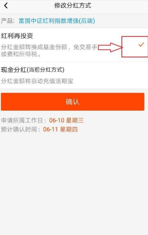 6、可以选择现金分红或红利再投资,选定后,右侧会有红色小勾出现,点击”确认“