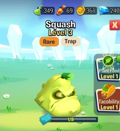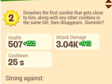 窝瓜具体的属性也是很不错的,如果是三级稀有品质,那生命就达到了507点,并且额外还会有152点。虽然说通常生命值并不是很高,但这一点血量就可以有效抵抗僵尸的轻攻击。攻击的伤害还是比较夸张的,基础就可以达到3.04k额外还可以增加913点,这伤害在面对普通的僵尸时也是没有任何压力的。就算是一些比较皮实的精英僵尸,照样也可以直接砸掉大半管血,只是冷却的时间要25秒,所以一定要注意,不要等到冷却时僵尸冲了过来。