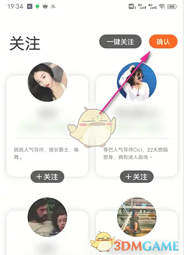 跳跳舞蹈app一键关注教程:打开跳跳舞蹈APP,进入关注界面查看对应的博主列表,找到想关注的博主后点击其账号右侧的“一键关注”按钮,在弹出的黄色确认框中点击“确认”,即可快速完成对该博主的所有内容关注。