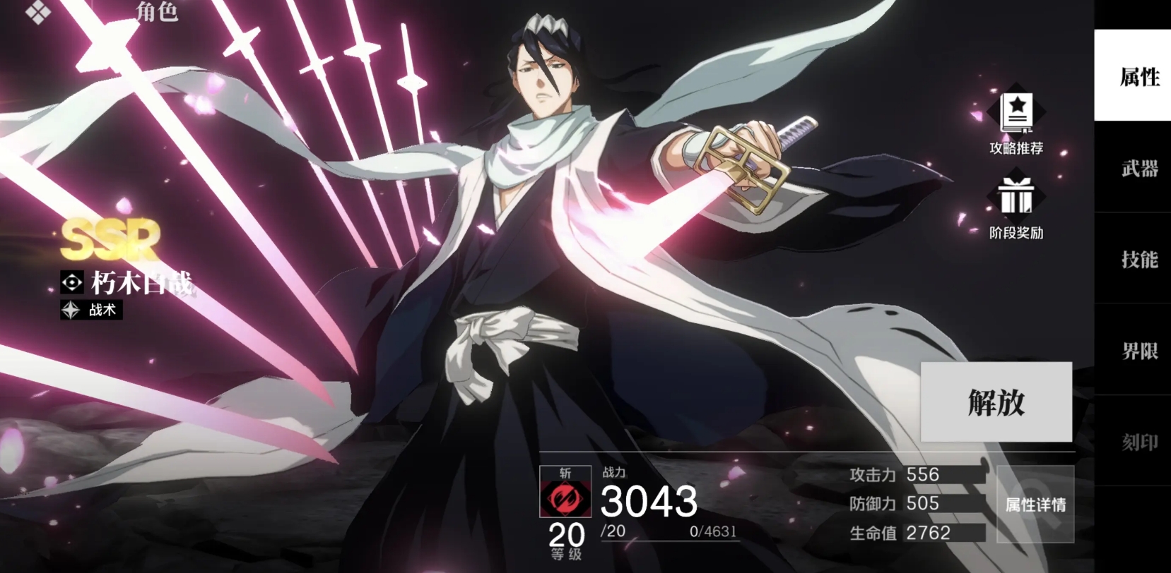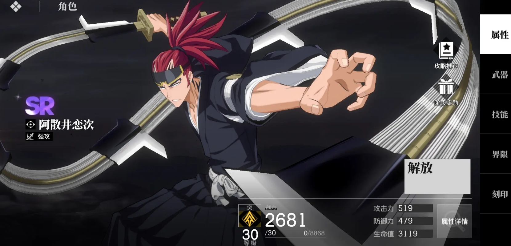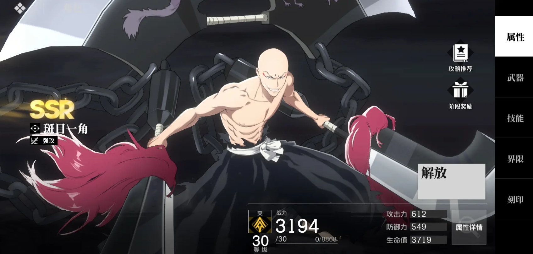 在完成灵压的积累后可长按普攻打出分支攻击,并能在命中后再追加一道大范围高伤害的横扫。其大招共有两段,释放时能直接进入卍解状态,同时获得战技能使用两次的效果,自身的能力也会得到提升,持续一段时间后或主动再按必杀能立刻释放第二段大招攻击。