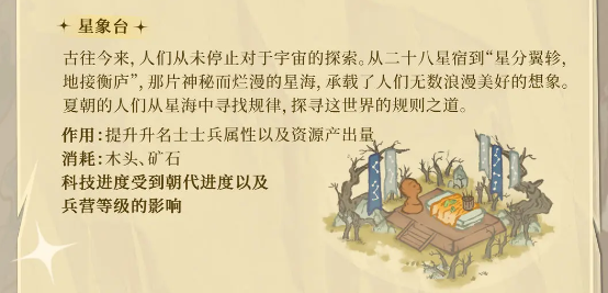 星象台能提升士兵以及名士的属性和资源产出量,不过科技进度会受到朝代进度和兵营等级影响。