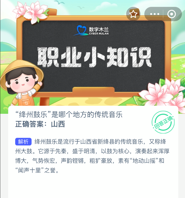 以上就是绛州鼓乐是哪个地方的传统音乐?支付宝蚂蚁新村最新答案2025年10月15日,更多精彩内容,请点击关注0405手游网更新!