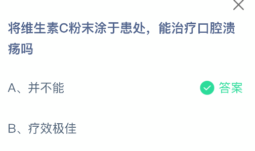 以上就是将维生素C粉末涂于患处,能治疗口腔溃疡吗,支付宝蚂蚁庄园2025年10月16日答案最新,更多精彩内容,请点击关注0405手游网更新!