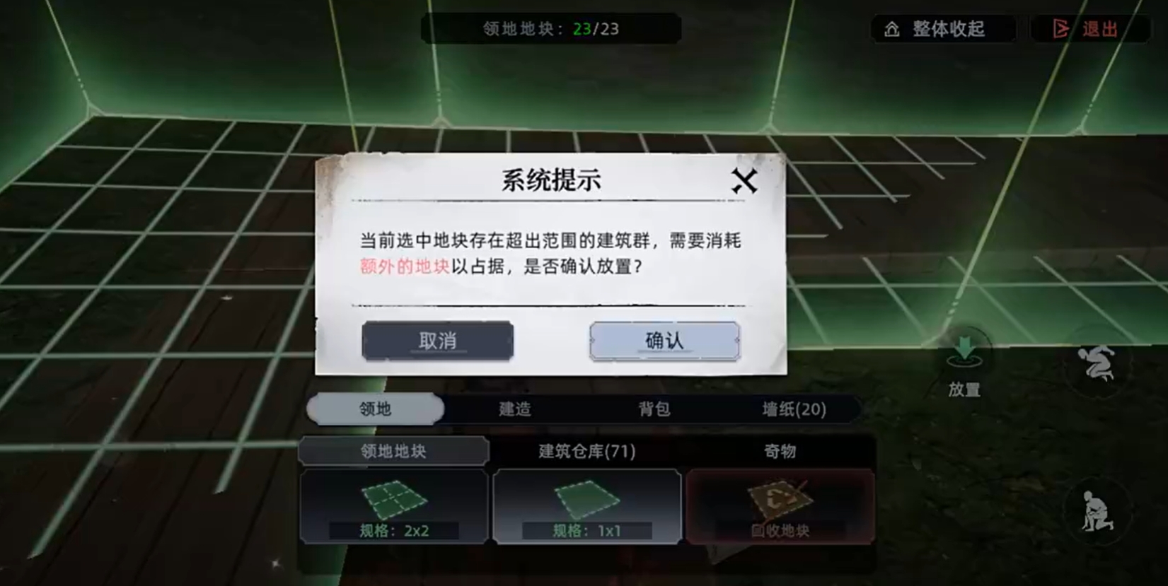 实际游玩时,各位可先进行标记,然后再在标记的地块上放置地基进行家园搭建,也能在与别人争夺地盘时先放地基,再对地基围住的区域进行地块标记。两种方法效果都一样,只不过在用后一种方式时,若各位标注的地块并没有完全包括住所放下的全部地基,会出现有建筑群超出地块范围的提醒,且游戏还会问玩家是否要消耗额外的地块,来完成对所有建筑群的标记,因此在标记速度上后一种会更快一些。这一小技巧在争夺建家位置时极为实用,所消耗的成本也只是一些地基而已。