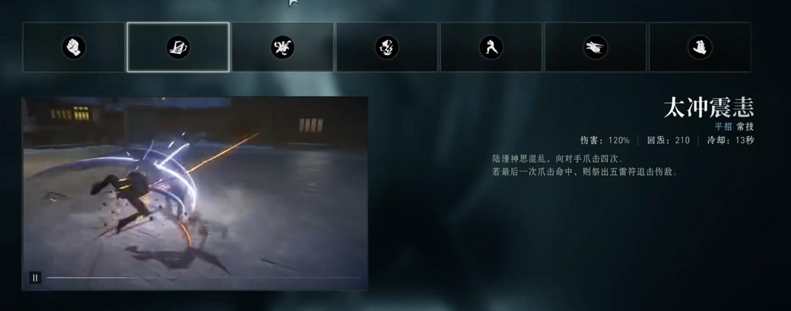 陆瑾的普攻大敦生憎是一个五段的普通玩法,每次伤害50%,回炁56点,是攒炁的重要方法,而且前三次普攻为直线爪击,后两次附带范围伤害,第五击命中后会触发短暂硬直,可衔接平招常技。平招中太冲震恚、曲泉交忿都是很强势的输出技能,前者四连击后接五雷符追击,曲泉交忿主打的是突进踢击接神霄雷符,但是太冲震恚的最后一击有0.5秒延迟,需提前预判距离,避免空招出真空期,很容易被抓住把柄。