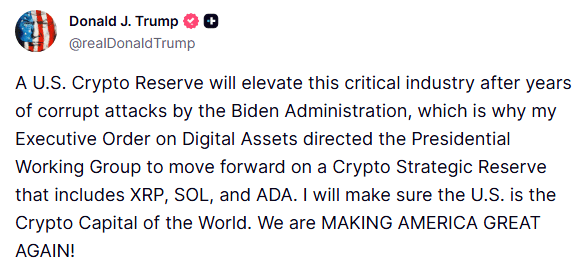 今年早些时候披露的这项计划中,唐纳德·特朗普总统特别点名ADA、XRP、ETH和SOL作为潜在储备资产。