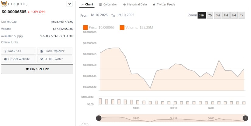当前FLOKI报价0.00006505美元,24小时跌幅1.37%,市值6.2849亿美元,日交易量超3781万美元。流通供应量9.65万亿枚,全球市值排名第143位。