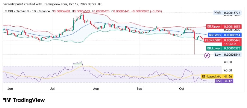 截至撰稿时,FLOKI/USDT交易于0.00006461美元附近,紧贴布林带下轨0.00005378美元,基线位于0.00008214。代币贴近下轨反映持续回撤后波动率压缩及潜在超卖状态。历史数据显示,当动量指标企稳时,此类形态往往预示复苏尝试。