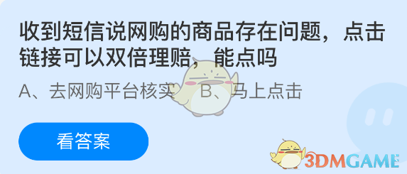 以上就是收到短信说网购的商品存在问题,点击链接可以双倍理赔,能点吗,支付宝蚂蚁庄园2025年10月21答案最新,更多精彩内容,请点击关注0405手游网更新!