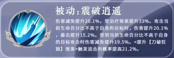 而他的被动技能叫做刀破狂狼,这个技能是给他自身的暴击带来额外提升的,此时提升了20%的暴击之后,他自身还会根据每10%的暴击概率,额外提升1%的伤害减免,当然这个百分比最多是可以叠加到20%的,再提升到20%伤害减免之后,他就无法再进行叠加了,如果这个被动触发了暴击的话,那么此时攻击提升的数值会有20%,最后的数值可以忽视反震,而且他会带来一个吸血的效果,并且有62%左右的概率发动一次追击的能力,这一次追击的话,还会提升自身29%的伤害数值,如果这个技能没有触发暴击的话,那么追击触发的概率就会减掉一半,这里的追击效果其实在每一个回合里面都是可以进行尝试触发的,但是一个回合只最多只能用一次。