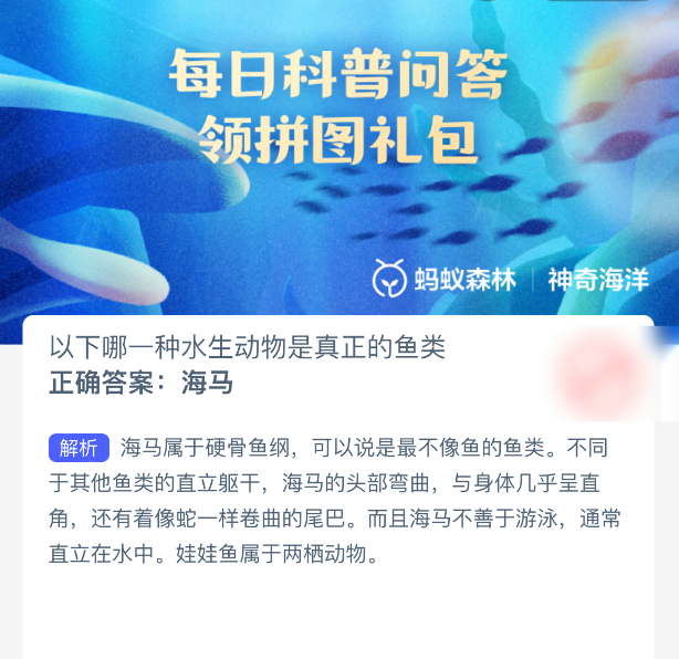 以下哪一种水生动物是真正的鱼类?【神奇海洋】10月21日新题目已开答!正确答案现已公布,点击领取拼图,一起为修复海洋生态贡献力量!今日正确答案是:【海马】,海马属于硬骨鱼纲,可以说是最不像鱼的鱼类。娃娃鱼属于两栖动物。
