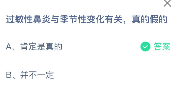 以上就是过敏性鼻炎与季节性变化有关,真的假的,支付宝蚂蚁庄园2025年10月22答案最新,更多精彩内容,请点击关注0405手游网更新!