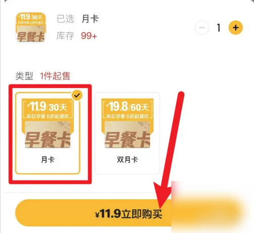 接下来选择早餐月卡,再点击【立即购买】就可以了