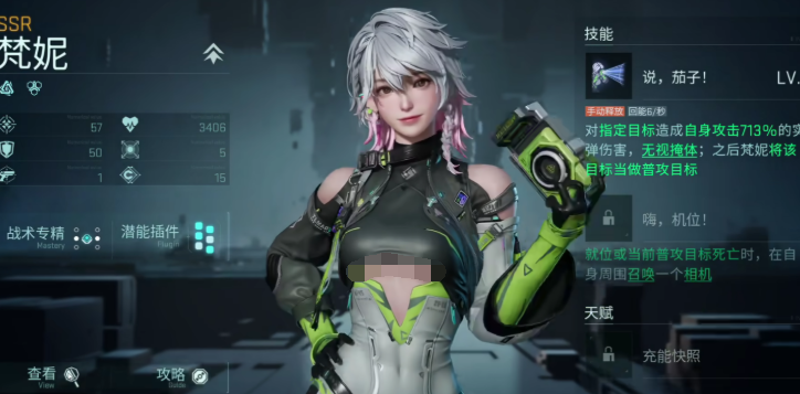 梵妮是游戏的远程输出型角色,拥有单体爆破能力,可以对制定的目标,造成基于自身攻击倍率的713%真实伤害,同时无视掩体,在成功造成伤害后,会持续性的进行单体目标追击。