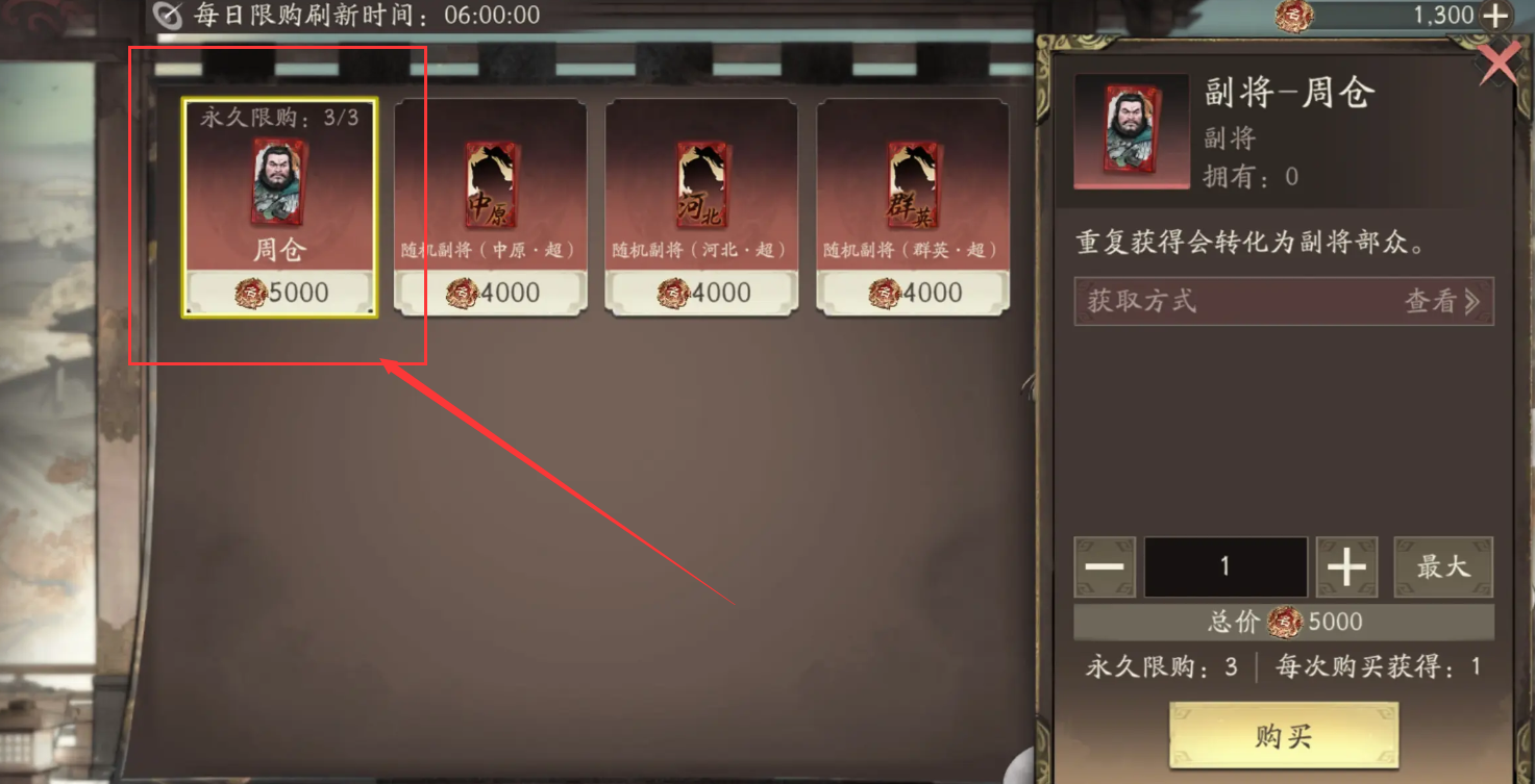 第三个方案是,玩家直接在游戏的商城内兑换,玩家使用五千枚副将碎片,即可直接兑换一个周仓,同时,在该商店内,可以兑换三个周仓单位,用于强化角色。