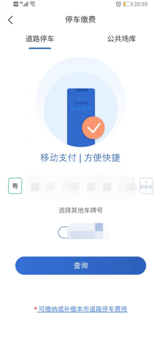 4、接着进入,选择道路停车或公共场库,选择需要缴费的车牌号,点击查询即可进入缴费页面缴费。