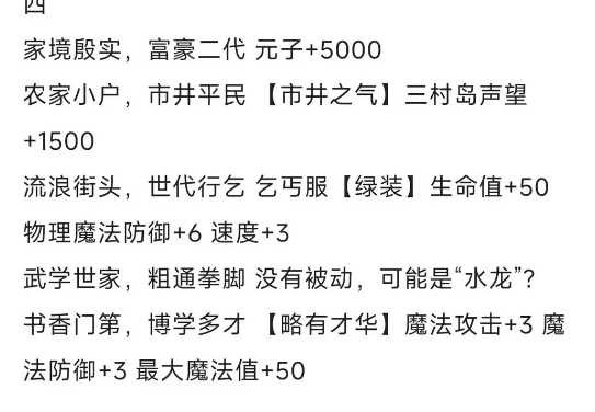 4.家境殷实,富豪二代 元子+5000(为什么这里选择元子,因为前期用元子的地方很多,比如筑基丹,做任务也需要;武学世家是自带野球拳,其实没必要练,前期所有门派都一样,不如王八拳过渡平滑,选择乞丐是睡梦罗汉拳,ps:一坨)