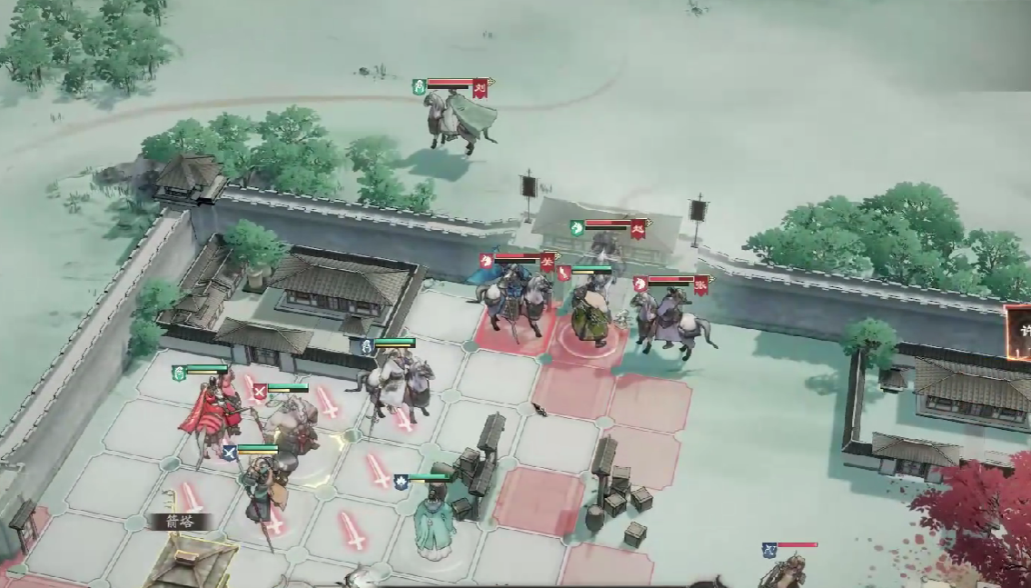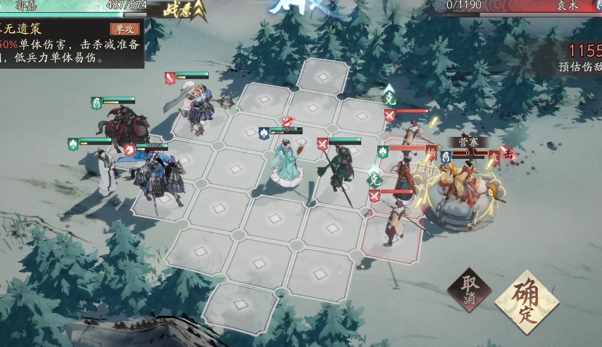 该章节的核心策略是,玩家需要率先使用骑兵占领敌方高地箭塔,随后使用自身的防御优势,直接绞灭敌方小兵,在小兵的阶段内,玩家需要尽可能的积攒战意和怒气,保证在第三回合袁术出现时,率领骑兵将其引至箭塔附近,随后所有角色释放怒气技能,展开一次剿灭。