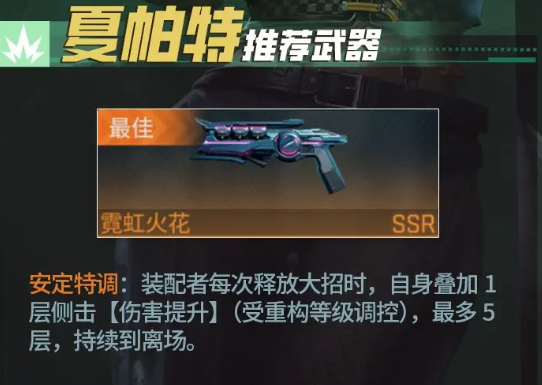 绝佳的武器就是霓虹火花,这把武器的效果还是很厉害的,在每一次释放大招之后都可以提升侧击的伤害,最多就可以叠加5层效果也可以一直持续到夏帕特离场。不管夏帕特是走侧击流又或者是大招流,那侧击都是很重要的来源伤害。在叠满5层之后,侧击的伤害就会有明显的飞跃,后期养成越深入,那输出也就会更猛。