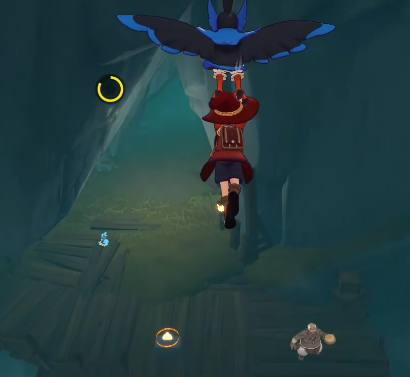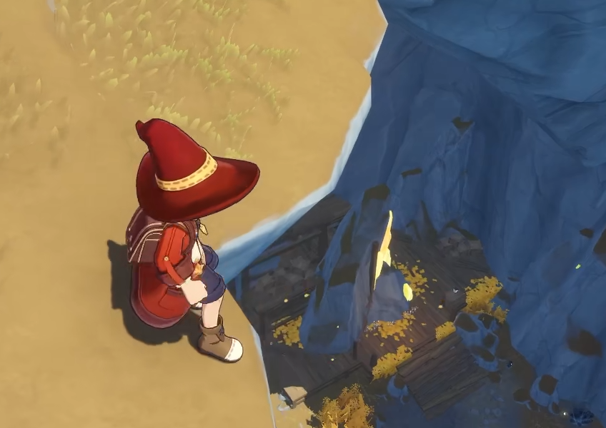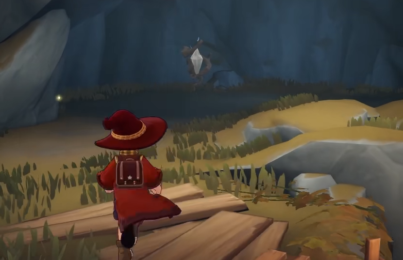 在左下方可以发现几块木板结构,并能看到一名NPC角色。此时召唤飞行坐骑,朝该人物所在位置飞行。落地后会出现一个洞穴入口,进入洞穴内部后,左侧设有一架木质梯子。攀爬上去后继续前行,即可抵达信仰者之村的核心区域——魔力之源所在点。