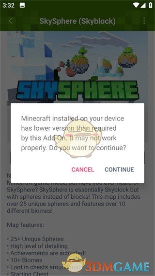5、在此界面点击CONTINUE,点击完成导入了,随后会自动跳转至我的世界游戏。
