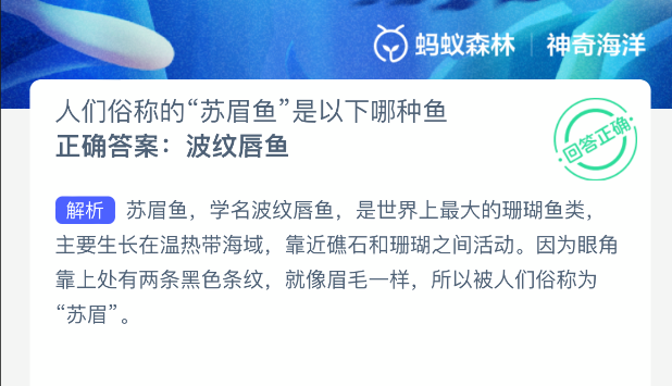 人们俗称的“苏眉鱼”是以下哪种鱼?【神奇海洋】11月25日新题目已开答!正确答案现已公布,点击领取拼图,一起为修复海洋生态贡献力量!今日正确答案是:【波纹唇鱼】。苏眉鱼,学名波纹唇鱼,是世界上最大的珊解析瑚鱼类,主要生长在温热带海域.