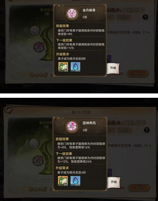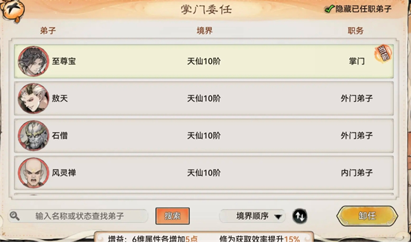 使用丹药前务必让该弟子成为掌门,不仅可以拥有6维获得5点增益,还有额外的修为获取效率提升15%,相当可观。