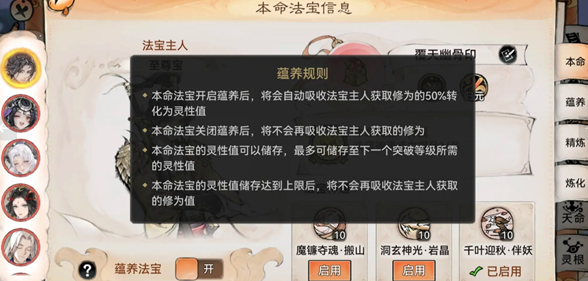 使用丹药之前一定要关闭法宝蕴养!一定要关闭法宝蕴养!一定要关闭法宝蕴养!重要的事情说三遍,一旦没有关闭,那么弟子获得的50%修为都会转化为灵性值,所以各位道友切记在使用丹药前一定要检查一遍。