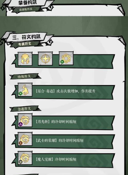 其实太刀暗影流派,它主要是流派之间的联动。太刀可以是火系,这里也就是火刀流,玩家可以直接搭配火刀流的烈焰残响、巨型气焰等技能,这样的话能够有效的提高覆盖率。而暗影流派则比较适合爆发,不过这里主要专注的就是暗影的体系,对于玩家来说,在使用暗影流派的时候,也需要找到核心的符文。那就是夜影穿爆,莫尔达克,额外的话,玩家还需要搭配六件套。