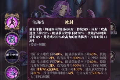 对范围内敌人造成魔法伤害,满级后持续5秒,期间目标移速降为0、攻速下降100%,能量获取下降,技能冷却延长5秒,很强。