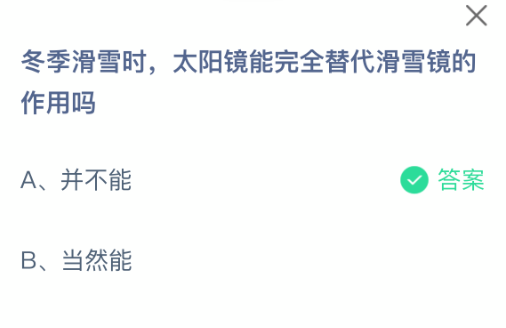 以上就是冬季滑雪时,太阳镜能完全替代滑雪镜的作用吗,支付宝蚂蚁庄园2025年12月12日答案最新,更多精彩内容,请点击关注0405手游网更新!
