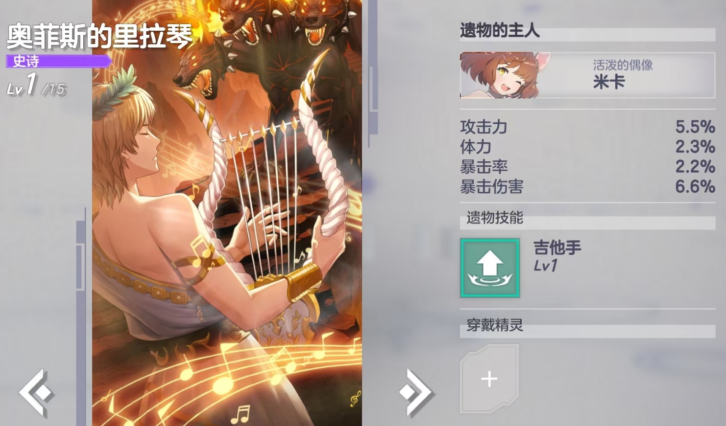 遗物本质是精灵的专属装备,每件遗物均预设唯一归属角色——即“遗物主人”。该设定决定了其词条属性与技能效果的高度定制化:当由指定主人佩戴时,不仅可激活全部基础属性加成,还将解锁专属技能,该技能等级随遗物本体等级同步成长,具备不可替代的战略价值。若由其他精灵穿戴,则仅生效属性部分,技能栏位处于锁定状态,无法触发。因此,在资源有限的前提下,优先为主角或核心输出精灵配置对应遗物,是提升整体战力效率最高的选择。
