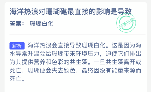 以上就是海洋热浪对珊瑚礁最直接的影响是导致?蚂蚁森林神奇海洋今日答案2025年12月18日分享,更多相关攻略内容,请点击关注0405手游网更新!