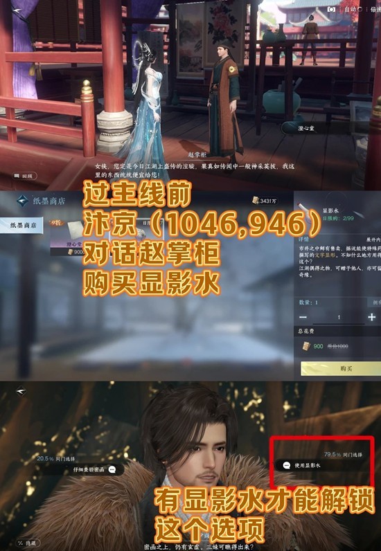 过主线前到汴京(1046,946)对话赵掌柜购买显影水,才能解锁剧情中用显影水的选择