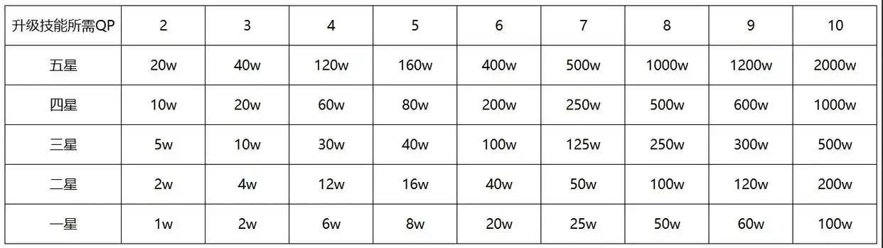 然后就是提升技能了,以上是每个星级的从者提升等级所需QP,大家可以优先把五星的等级都升满,现在的结晶其实也蛮多的,然后四星和低星从者,可以把所有充能技能,以及追加2技能都点满。