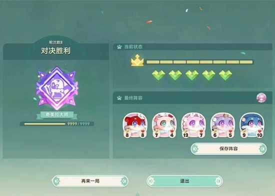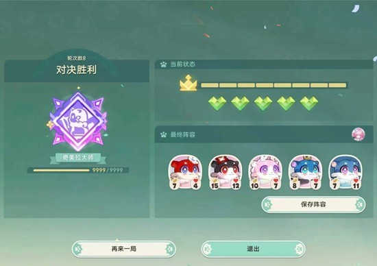 (5)【重点!!】因为锦标赛胜利八轮就会强制结束对战,保留队伍,昔米露是美局对战过后提升随机一名奇美拉攻击和专属奇美拉额外经验,所以要多进行对战。在最初队伍没成型的时候,多去输掉或者打平比赛,比如刷新的时候锁定奇美拉但不放进队伍里面,或者把一些后期发力前期容易死的奇美拉放在前面之类的,总之就是要多输。