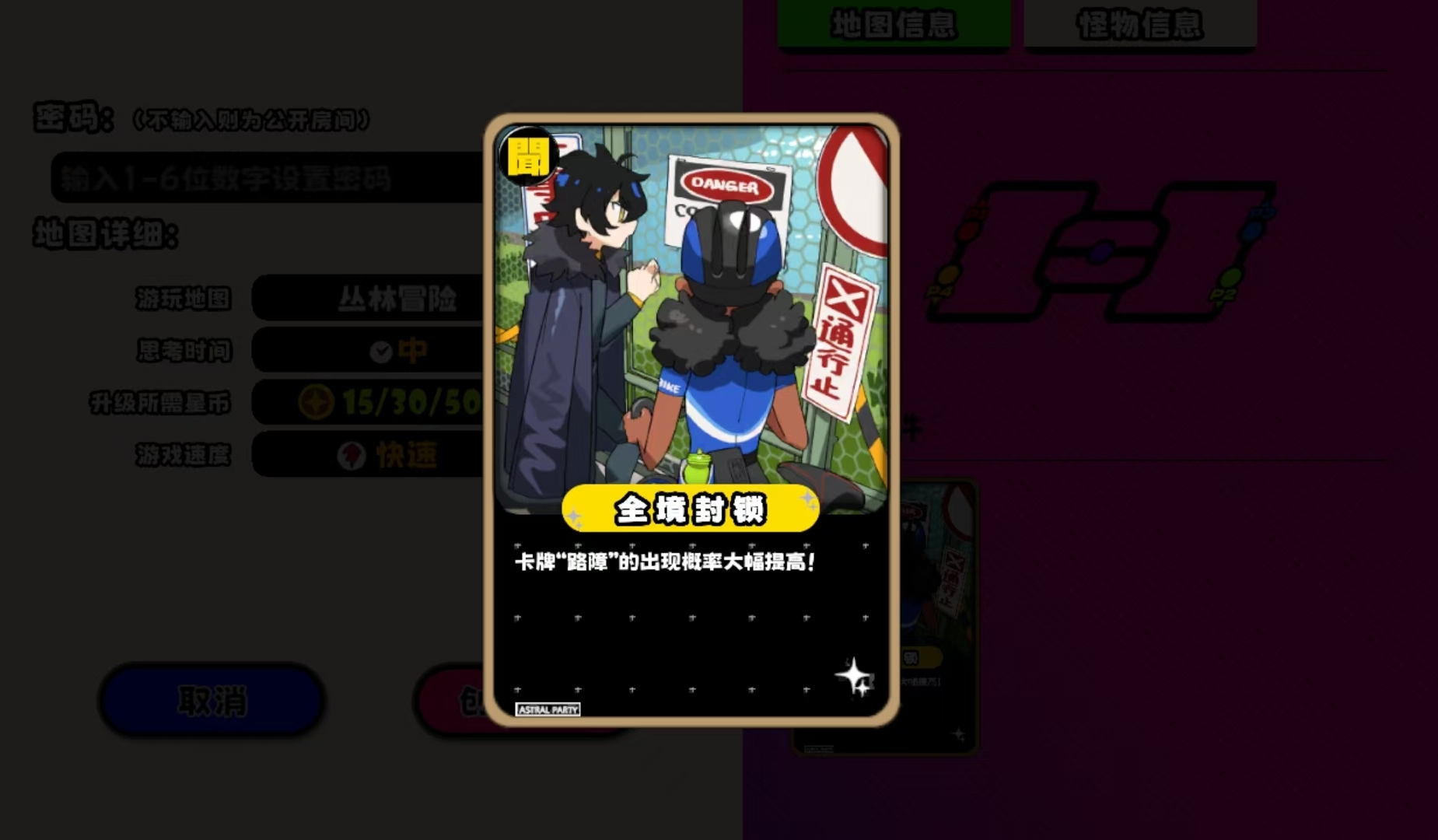 从设计上来看,丛林冒险是张关键路口非常多的标准模式地图,再加上它的机制里存在着路障手牌出现概率提升的设定,所以合理的去利用路障来阻碍他人移动,成为了人们能否玩转丛林冒险这张图的关键。所谓路障手牌,就是能让玩家们在使用它时进行路障放置,当其他玩家路过存在着路障的格子时,不管他们还剩下多少移动点,都会因路障的效果被迫停下来,本回合内无法再继续用移动点来移动。路障被触发后就会消失,不触发时就会一直在地图上存在,并且该手牌没有使用数量限制,只要人们本回合使用手牌的次数没达到上限,且手里还有路障手牌,那就能一直放置。