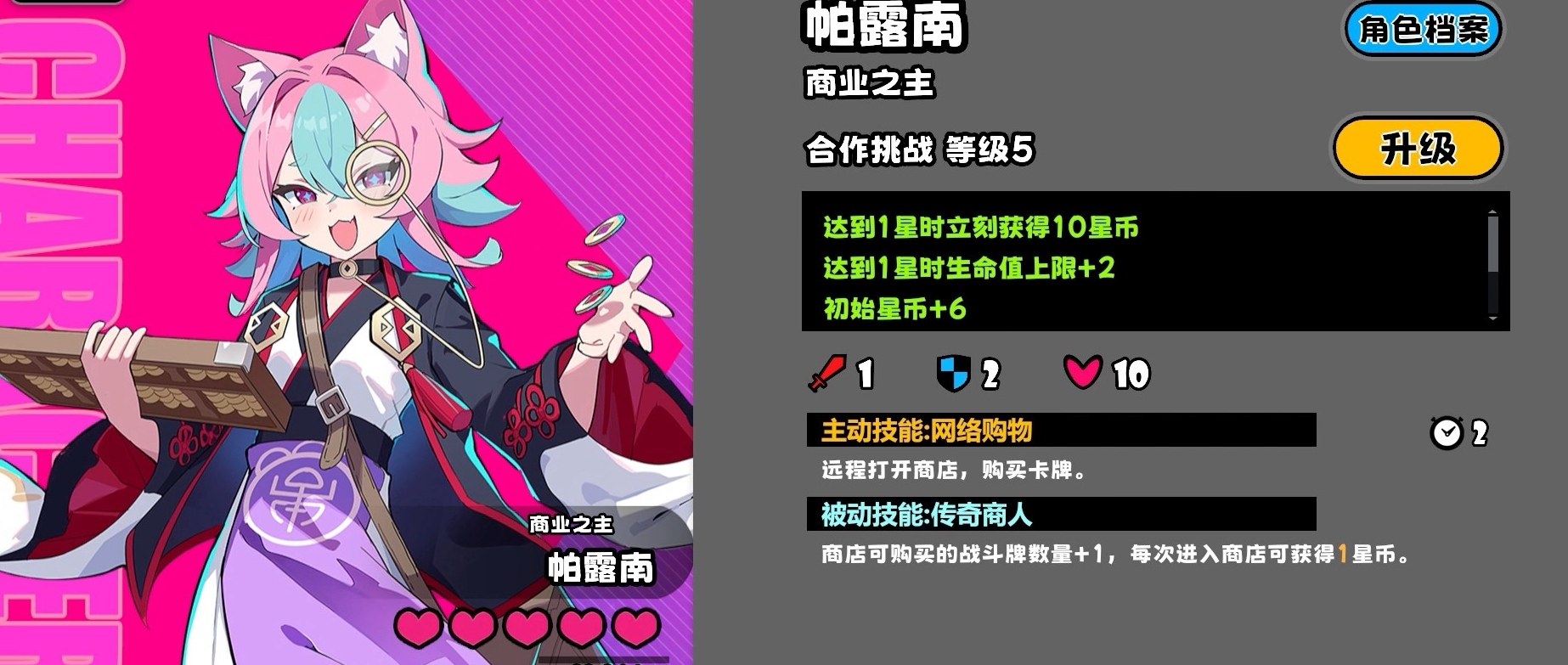 帕露南的主动技能名为【网络购物】,施放后可远程激活商店界面,直接完成卡牌购置动作;其被动技能【传奇商人】则提供持续性经济增益——每次进入商店时额外获得1次购买机会,并固定获取1星币。当合作挑战等级提升至1星时,立即获得10星币,生命上限+2,初始星币+6;升至3星后,攻击力、防御力与移动速度各+1,且重选强化筹码次数+2。