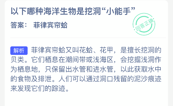 以下哪种海洋生物是挖洞“小能手”?【神奇海洋】2026年1月2日新题目已开答!正确答案现已公布,点击领取拼图,一起为修复海洋生态贡献力量!今日正确答案是:【菲律宾帘蛤】。菲律宾帘蛤又叫花蛤、花甲,是擅长挖洞的贝类。