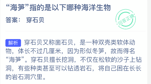 “海笋”指的是以下哪种海洋生物?【神奇海洋】2026年1月3日新题目已开答!正确答案现已公布,点击领取拼图,一起为修复海洋生态贡献力量!今日正确答案是:【穿石贝】。穿石贝又称凿石贝,是一种双壳类软体动物,体长不过几厘米,因为形似冬笋,故而得名"海笋"。