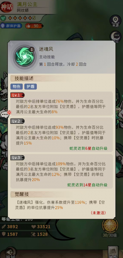 可以带来迷魂风这个主动技能的效果,同时拥有物伤以及护盾能力,使用这个技能可以对敌方中后排单位造成76%物伤,并为生命百分比最低的2名友方单位附加空灵盾的防护,护盾值等同于漓月公主最大生命的8%所以如果漓月公主要组队的话,一般想要这个主动技能更好用,队伍当中就一定要放一些能够加强漓月公主生命的其他角色,且漓月公主越强的时候能够带来的护盾越高,后期提升到14星级的时候携带空灵盾的单位在抗暴上面还可以继续提升20%,而迷魂风技能在强化后,可以达到的伤害系数提升到116%,此时携带空灵盾的单位抗暴上就是提升25%的数值了。